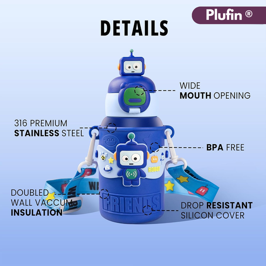 Plufin™ SipBuddy – Cute Kids Water Bottle with Spill-Proof Lid Dark Blue (500ml)